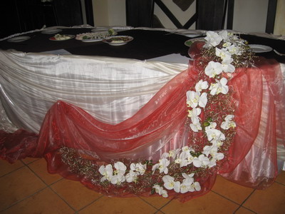 Этим я начала заниматься за неделю до свадьбы, когда уже приехала в Минск. Я не хотела тратить много денег на украшение зала ради 1 вечера, но с другой стороны хотелось, чтобы беседка выглядела свадебным торжеством. Поэтому решила украсить: драпировка столов, 6 колонн тканью, вход в беседку, искуственные цветы по бокам столов, торцы столов. Обращалась во многие агенства – цены называли от 350 до 600 у.е. Плюс хотели еще взять за бензин (усадьба в 60 км от Минска), за монтаж, демонтаж. Как-то неоправданно дорого  Но я нашла девушку – Александра Широкова из агенства «Миллион идей», которая шла нам навстречу во всех вопросах, очень гибкая, адекватная и с прекрасным вкусом. (Например, отговорила меня украшать мостик тканью. И действительно, смотрю на фотографии – украшение только испортило бы общий вид!).