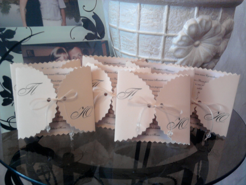 Вот это вот наши пригласительные, так как фото сделано на мобильный, то цвет не передается, а вообще они персикового цвета. Как вам???