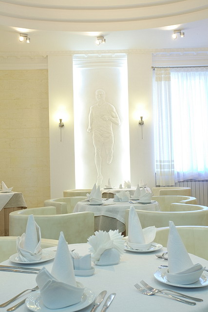 Вот фотографии нашего интерьера в ресторане. Единственная проблема - это огромный спортсмен на стене, около которой мы хотим поставить стол молодых. Сейчас ведм переговоры с оформителями, чтобы данного объекта спрятать на время торжества)