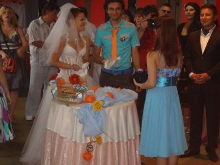 еще есть времечко!!! вы уж извините, что в таких попыхах рассказываю)) выпили мы, выпили, мама нас провела...выходит на улицу - а там людей!!!! :shock: конфетки покидала, в машины загрузились и поехали на фотосет :D если б вы тольк видели ,как прохожие скручивали головы!!! у них отвисала челюсть!!! а больше всего бросалась красная шляпа нашего друга)) (я не смогу это описать, я лучше потом фото выложу) съездили на стену..и потратили там кучу времени!!! оч жаль((( но фото с машиной ,в ней, на ней, с гитарой, трубой, скрипкой, граммофоном!!!!!и начали по времени очень сильно вылетать, бегом помчались к граффити, но фоткаться бфло невозможно - вылезло солнце :roll: потом в парк горького, там пару фото - и в ЗАГС!! там было очень волнительно, я все никак не могла понять, что происходит..голова шла кругом...и вот нас ставят перед дверями...предыдущая пара задерживается...а когда открывается дверь гости той свадьбы таращатся на НАС!!!! а мне это в кайф!!!! мне так весело!!!! и вот заходим мы!!! музыка.....и у меня начинают накатываться слезы (муж сказал, что и у него тож :D ) стоит, держимся, пытаемся речь слушать...спрашивают...Муж долго молчит(я в это время думаю - засранец!!!) , а потом - ДА!!! я тож вроде согласилась)) поставили подписулечки, мой братик поднес нам колечки, обменялись, нас объявили мужем и женой - гром апплодисментов!!! =D> прошли в зал - глупые вопросы, скукотища))) надула 4 детенка))) и вот надо показаться всем))) выходим ИЗ загса, муж берет меня на руки..сыплются лепесточки, все кричат..голова кругом!!!!гостей рассадили по машинам и отправили в ресторана, а сами загрузились в свой кадиллак и поехали в парк напротив Виктории..там, конечно, фонтаны не работали, мы жутко устали, цветы от жары поникли((( но рядрм был МУЖ (обажаю это слово!!!) я была счастлива)))