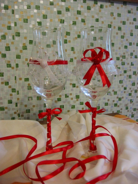 Что у меня уже готова: 1.Бокалы "Неман", купли именно такие, т.к. шампанское пить не будем, а будем пить белое вино рюмки для битья, тоже Неман, украсила бантиком