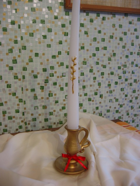 Купила свечку и подсвечник (2 шт, в Загс, один пластмассовый, а другой глиняный и покрашен золотым, вот только не знаю, какой лучше смотрится)