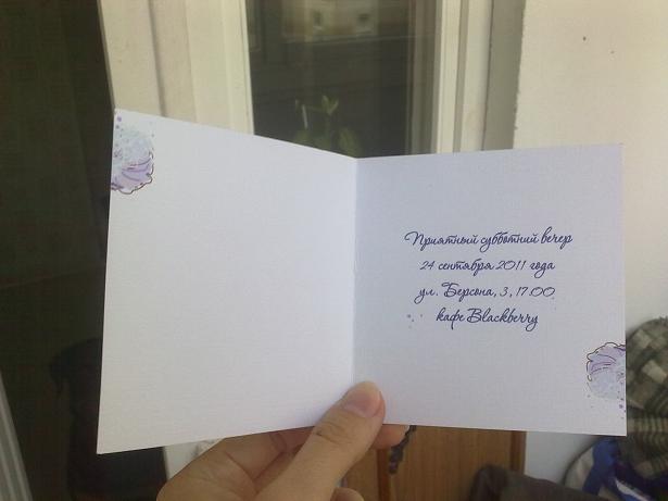 девочки мои милые!! спасибо вам большое) сижу и улыбаюсь) надеюсь гостям текст тоже понравится, потому что я долго мучилась из-за его немного нестандартности) буду подписывать каждое приглашение от руки) каждому хочу уделить свое время) надеюсь сегодня успеть забрать, завтра подписать и раздать (пока они мне не разонравились  ) зы: если кому-то очень понравились цветочки, то могу одолжить, есть еще в красном (малиновом), вроде в голубом... а может и еще в каком цвете, надо глянуть в своих закромах Dxmchik, визани-штамп (как-то так), на маркса, 40, офис 30) со мной были все вежливы очень, только бумаги там не очень большой выбор был)