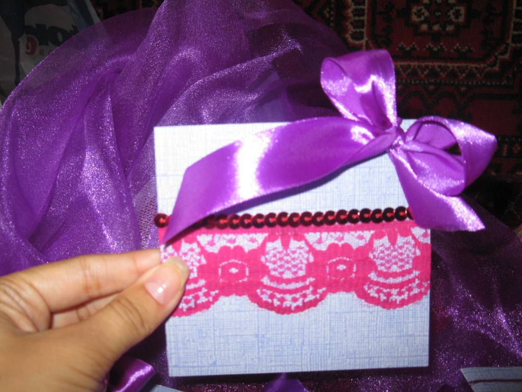 А пригласительные на самом деле почти все разные, хотя такой задумки изначально не было  Само собой так вышло, что я вошла во вкус и начала выдумывать.  Вчера ещё закупила разных тесёмочек и кружева, а мама моя всё удивляется, сколько это мне доставляет удовольствия  Мол, как мало надо для счастья, всего лишь 3 метра красивой ленты Хочу сделать сама красивый большой бант на машину, купила фатина (он есть на фото пара страниц назад), только он очень мягкий, придётся крахмалить или желатинить его, чтобы торчком был.