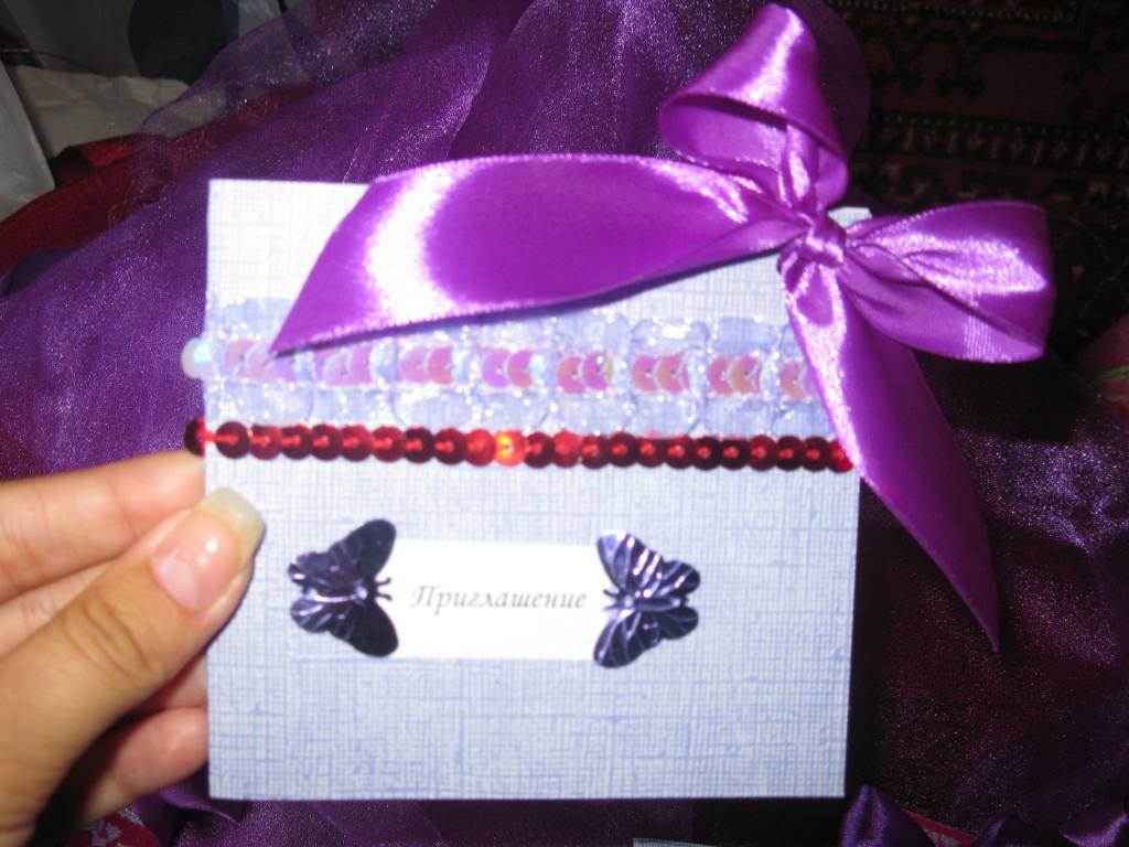 Пригласительные-просто мега супер!!!Очень красиво и главное-оригинально!!!  Бабочки меня сразили!!!Очень мило! А наши будут на след.неделе готовы  Блин,вот был бы принтер,я бы уже давно все сделала!А то эта типография..Но ,думаю,все успеем..Сразу начнем развозить приглашения-за 2 недели-думаем,будет нормально..