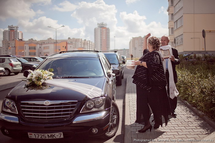 Ну что,начнём-с)) Предупреждаю сразу,что писать красиво я не умею)) 29.07.2011 Утро... Проснулась я раньше,чем зазвонил будильник,в 04:45.Лежу,прислушиваюсь к себе "Ну,что плакать будем?"На погоду даже внимание не обратила,да и темно ещё было.Выхожу из комнаты,все домашние ещё спят сладким сном)))Сварила кофе и пошла на балкон курить.Голова совсем пустая,никаких мыслей,эмоций,даже обидно стало)))Приняла ванну,потом уже родители встали и понеслось....Я всех предупредила,меня не трогать,вопросы не задавать,в комнату,где я буду собираться и наводить красоту не заходить,советов не спрашивать. В 6:15 приехала Диана Ясенцева и начала делать мне причёску.Она очень позитивный человек,мы шутили,смеялись.Потом,в 8:00 приехала Элина Лев.ООооооо,она принесла в мой дом смех,радость и ощущение праздника!!!Я очень переживала,что мы не успеем накраситься,а Элина сказала:"Да,плевать на время,лови последние моменты вольной жизни,неси кофе и пошли покурим"))))Вот стаю я такая с фатой на балконе с сигаретой,))) смеюсь как сумашедшая,люди идут на работу (пятница),смотрят на меня и улыбаются)))Суппер-позитивная невеста!Привезли мой букет,бутоньерки,браслет для свидетельницы,украшения для машин.Приехала Яна Катье с ассистенткой (фотограф),я если честно даже не заметила во сколько они пришли.Начали фоткать моё платье,кошку,туфли....9:30 пишу смс БМу,что машина за ним выехала,что б не забыл очки,и что я его очень ЛЮБЛЮ!В комнату зашла мама,увидела меня и разрыдалась.Я и сама была в шоке от такой красоты!Начали меня одевать.А в это время слышу ""Приехали!!!" и крики БМ под окном "Оля,я тебя очень люблю!!!!"Я стаю в платье и выбираю,что одеть:колготки,чулки или гольфы.В итоге одела бежевые гольфы))) хотя собиралась одевать свои красивые беленькие гольфы в сеточку и с ленточками,но в них не смогла обуть туфли(((( Начался выкуп,я была в комнате одна,слышала только смех.Стаю,смотрю в окно,прощаюсь мысленно с детством (которое до сих пор не могло никак закончиться),и так грустно вдруг стало.Я так долго ждала этот день и вот он настал.Я настоящая невеста,самая красивая,самая любимая.Даже сейчас слёзы наворачиваются.Я запомнила этот момент на всю жизнь.Потом открывается дверь (тихонько так) и я слышу голос БМ "Оля,повернись ко мне" (а я ж в окно смотрю,всё как в кино),я поворачиваюсь....Блин,какой он красивый,мой БМ,в костюме,с букетом (я никогда не видела его в костюме за 5 лет).Он падает на калено,вручает мне букет,потом целует...БМ не ожидал,что я буду такая,он был в лёгком шоке)))ПрЫятно... Быстренько выпили,мама через слёзы благославила нас иконой,завязали нам руки и мы пошли к машинам.Я побрасала конфеты и поехали.....