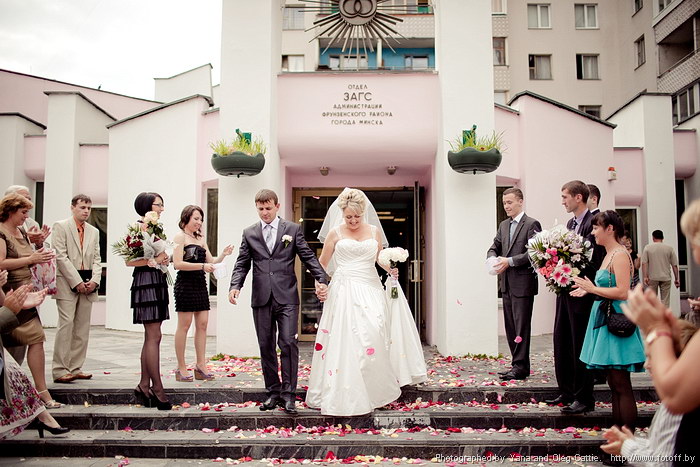 Хочу сказать про своё платье.На форуме много споров:платье со шлейфом или без??Мой шлейф можно было приколоть,но я весь день и весь вечер носила его на руке или просто опускала на землю.Он совсем мне не мешал,а без него платье смотрится как огрызок)))Только в туалет сложговато было ходить)))Конечно,платье уже к вечеру было грязным внизу,но это заметила только я.Но...в след.раз,когда буду выходить замуж (ну это я шучу так  ) я одену короткое,лёгкое платье Когда мы были на Минск-Арене мне захотелось в "дамскую комнату".А куда сходить?  Нашли какой-то ресторанчик прямо в здании.Заходим с сестрой,на входе охранник "Я вас не пущу и всё!" Я в шоке,понимаю что до ЗАГСа не доеду ))) Вот думаю,козёл,жалко ему что ли?Потом из ресторанчика вышла компания,набросилась на этого охранника,что бы он пустил меня,а я уже чуть не плакала.Вообщем,слава богу,сделали мы свои дела,а то могло случиться ЧП.Бывают же такие тупые,непонятливые люди. В 13:50 мы были уже возле ЗАГСа.Мы вообще в этот день везде успевали.Роспись была в 14:20.Стоим с БМ перед дверью,которая вот-вот должна открыться,приготовились...и тут я читаю над дверью надпись "Ритуальный зал".Меня как пробрал смех,я не могла остановиться,дамочка пыталась меня успокоить,но бесполезно  Так со смехом и вступила в брак  Из ЗАГСа ничего не помню,всё как в тумане.Я не плакала,а смеялась.Я вообще за весь день ни разу не заплакала,что очень меня удивило  Какая-о ненормальная невеста))
