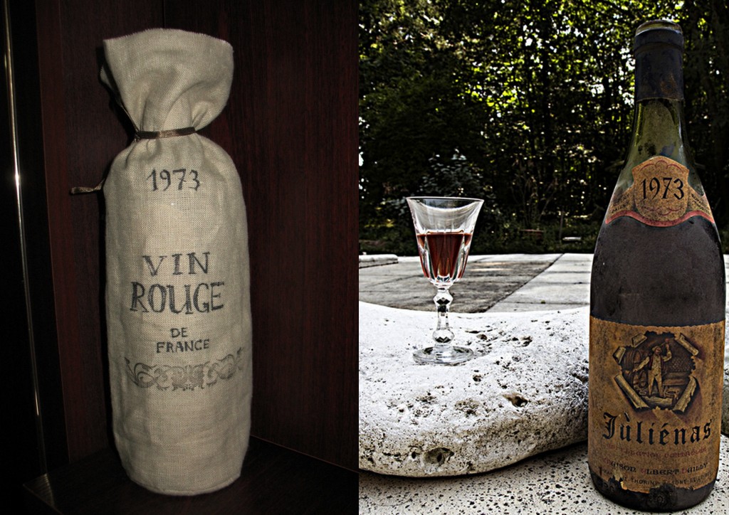 Купила бутылочку вина французского, 1973 года  упаковала) Краски по ткани мои чуток подсохли, на коробке написано, что разбавлять только разбавителем специальным, воду лить туда не захотелось. Поэтому надпись маркером, потом переделаю)