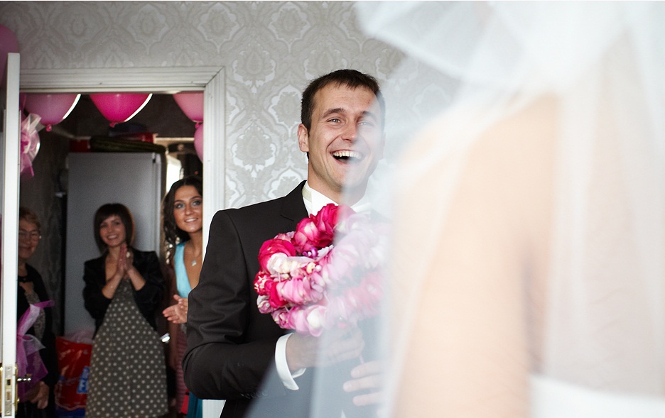 все кинулись смотреть на кабачок =)))) Классные эмоции на лице жениха, сразу видно, образ невесты одобрен самым главным человеком