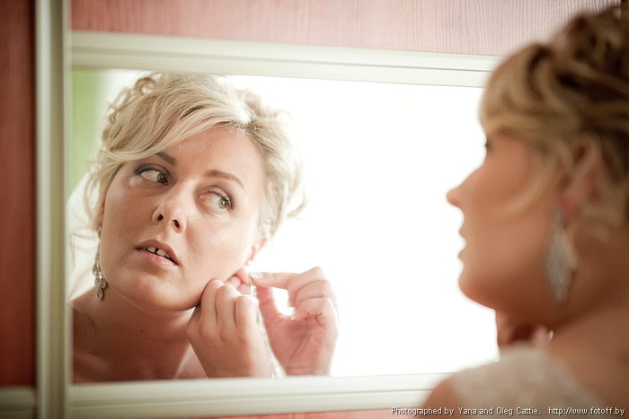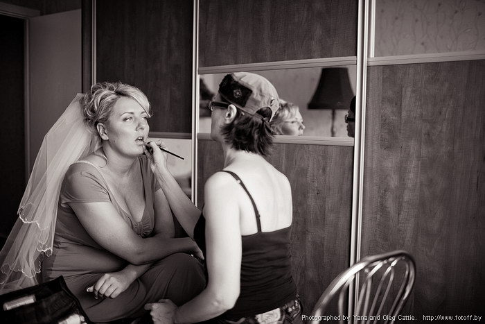Ну что,начнём-с)) Предупреждаю сразу,что писать красиво я не умею)) 29.07.2011 Утро... Проснулась я раньше,чем зазвонил будильник,в 04:45.Лежу,прислушиваюсь к себе "Ну,что плакать будем?"На погоду даже внимание не обратила,да и темно ещё было.Выхожу из комнаты,все домашние ещё спят сладким сном)))Сварила кофе и пошла на балкон курить.Голова совсем пустая,никаких мыслей,эмоций,даже обидно стало)))Приняла ванну,потом уже родители встали и понеслось....Я всех предупредила,меня не трогать,вопросы не задавать,в комнату,где я буду собираться и наводить красоту не заходить,советов не спрашивать. В 6:15 приехала Диана Ясенцева и начала делать мне причёску.Она очень позитивный человек,мы шутили,смеялись.Потом,в 8:00 приехала Элина Лев.ООооооо,она принесла в мой дом смех,радость и ощущение праздника!!!Я очень переживала,что мы не успеем накраситься,а Элина сказала:"Да,плевать на время,лови последние моменты вольной жизни,неси кофе и пошли покурим"))))Вот стаю я такая с фатой на балконе с сигаретой,))) смеюсь как сумашедшая,люди идут на работу (пятница),смотрят на меня и улыбаются)))Суппер-позитивная невеста!Привезли мой букет,бутоньерки,браслет для свидетельницы,украшения для машин.Приехала Яна Катье с ассистенткой (фотограф),я если честно даже не заметила во сколько они пришли.Начали фоткать моё платье,кошку,туфли....9:30 пишу смс БМу,что машина за ним выехала,что б не забыл очки,и что я его очень ЛЮБЛЮ!В комнату зашла мама,увидела меня и разрыдалась.Я и сама была в шоке от такой красоты!Начали меня одевать.А в это время слышу ""Приехали!!!" и крики БМ под окном "Оля,я тебя очень люблю!!!!"Я стаю в платье и выбираю,что одеть:колготки,чулки или гольфы.В итоге одела бежевые гольфы))) хотя собиралась одевать свои красивые беленькие гольфы в сеточку и с ленточками,но в них не смогла обуть туфли(((( Начался выкуп,я была в комнате одна,слышала только смех.Стаю,смотрю в окно,прощаюсь мысленно с детством (которое до сих пор не могло никак закончиться),и так грустно вдруг стало.Я так долго ждала этот день и вот он настал.Я настоящая невеста,самая красивая,самая любимая.Даже сейчас слёзы наворачиваются.Я запомнила этот момент на всю жизнь.Потом открывается дверь (тихонько так) и я слышу голос БМ "Оля,повернись ко мне" (а я ж в окно смотрю,всё как в кино),я поворачиваюсь....Блин,какой он красивый,мой БМ,в костюме,с букетом (я никогда не видела его в костюме за 5 лет).Он падает на калено,вручает мне букет,потом целует...БМ не ожидал,что я буду такая,он был в лёгком шоке)))ПрЫятно... Быстренько выпили,мама через слёзы благославила нас иконой,завязали нам руки и мы пошли к машинам.Я побрасала конфеты и поехали.....