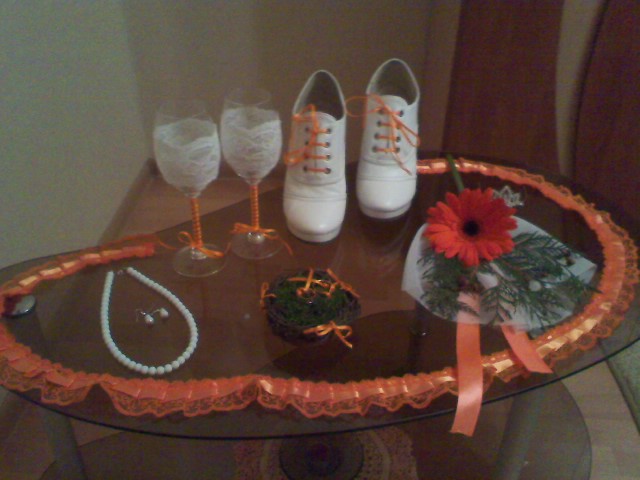 Часть первая, предсвадебная.Основательную подготовку я начала за полторы недели до свадьбы. Основные моменты были обсуждены, придуманы, распланированы заранее, конечно, а вот всякий хендмейд, мелкие покупки, сбор реквизита и прочее делала непосредственно перед свадьбой. Для этого бросила работу на две недели (блин, уже скучаю по ней  ) и плотненько занималась подготовкой. Как я не старалась все сделать как можно быстрее и перед самой свадьбой быть на расслабоне, но все равно на последние дни много дел осталось... Для чего-то нужен был муж, для чего-то машина и т.д. Но мы все успели!!! Нет ничего, что я бы хотела сделать, да не смогла. Единственное что, я сначала думала побольше украшений сделать, но мой пыл успокаивали ))) Просили не делать в лесу городской интерьер ))) Последние дни (среда, четверг) у нас были расписаны по часам с утра до вечера... Но подготовка была очень приятна! Мы даже почти не ругались ))) С нашими темпераментами я боялась, что на нервах мы можем черти знает что натворить-наговорить друг другу ))) В последний вечер мы занимались в основном поделками... Плот, украшения на машины, бокалы, букеты мне и дочке, бутоньерку, соседка кое-что в платье доделывала (простите, что фотки так и не сбросила еще  сча пороюсь что у меня есть на телефоне или поспрашиваю фоткал ли нас кто-то из друзей (я даже не знаю  не обращала внимания ))). Еще гладили костюмы, упаковывали окончательно пакеты, наводили порядок в квартире и т.д. Катя - подружка и главная помощница легла примерно часа в два, Леша лег около трех наверное... Когда я все закончила, было уже примерно 4-30, а в 6-00 приходит Сандра... Конечно же я не пошла уже спать (мне даже не особо-то и хотелось, честно говоря. Но не из-за нервов! Просто от эмоций и ожидания треша ))). Оформила столик с поделками-украшениями, приняла душ, попила кофе, посидела на форуме конечно же ))) Делала фотки на телефон для вас, хотела выложить пока не пришла Сандра, но не успела. И боюсь, что и так плохое качество мог испортить тусклый свет ((( Сейчас посмотрю что там получилось и может покажу чего-нить Вот так закончилась моя подготовка... Пришла Сандра и началось превращение )))