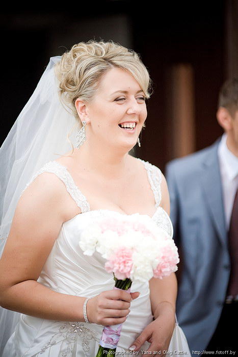 Хочу сказать про своё платье.На форуме много споров:платье со шлейфом или без??Мой шлейф можно было приколоть,но я весь день и весь вечер носила его на руке или просто опускала на землю.Он совсем мне не мешал,а без него платье смотрится как огрызок)))Только в туалет сложговато было ходить)))Конечно,платье уже к вечеру было грязным внизу,но это заметила только я.Но...в след.раз,когда буду выходить замуж (ну это я шучу так  ) я одену короткое,лёгкое платье Когда мы были на Минск-Арене мне захотелось в "дамскую комнату".А куда сходить?  Нашли какой-то ресторанчик прямо в здании.Заходим с сестрой,на входе охранник "Я вас не пущу и всё!" Я в шоке,понимаю что до ЗАГСа не доеду ))) Вот думаю,козёл,жалко ему что ли?Потом из ресторанчика вышла компания,набросилась на этого охранника,что бы он пустил меня,а я уже чуть не плакала.Вообщем,слава богу,сделали мы свои дела,а то могло случиться ЧП.Бывают же такие тупые,непонятливые люди. В 13:50 мы были уже возле ЗАГСа.Мы вообще в этот день везде успевали.Роспись была в 14:20.Стоим с БМ перед дверью,которая вот-вот должна открыться,приготовились...и тут я читаю над дверью надпись "Ритуальный зал".Меня как пробрал смех,я не могла остановиться,дамочка пыталась меня успокоить,но бесполезно  Так со смехом и вступила в брак  Из ЗАГСа ничего не помню,всё как в тумане.Я не плакала,а смеялась.Я вообще за весь день ни разу не заплакала,что очень меня удивило  Какая-о ненормальная невеста))
