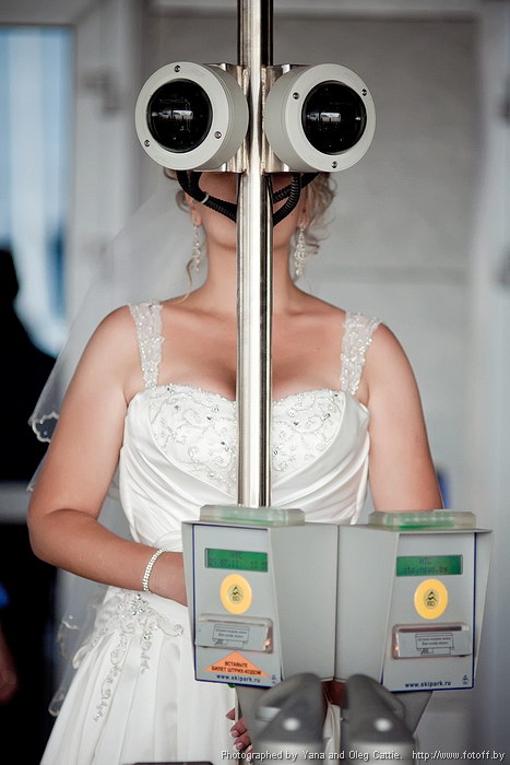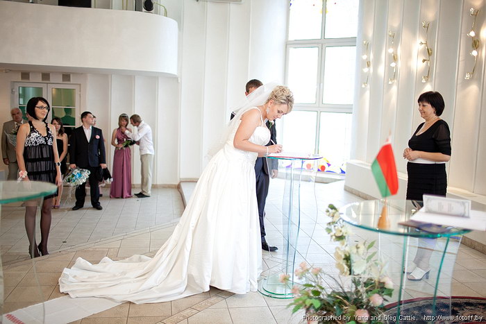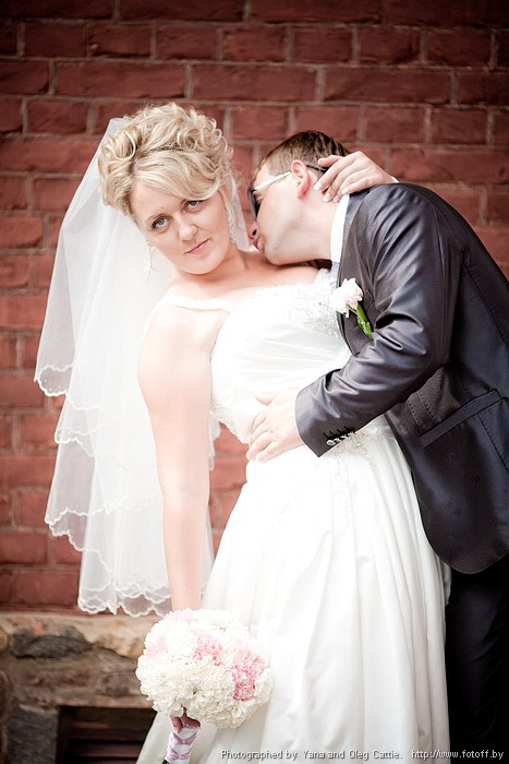 Хочу сказать про своё платье.На форуме много споров:платье со шлейфом или без??Мой шлейф можно было приколоть,но я весь день и весь вечер носила его на руке или просто опускала на землю.Он совсем мне не мешал,а без него платье смотрится как огрызок)))Только в туалет сложговато было ходить)))Конечно,платье уже к вечеру было грязным внизу,но это заметила только я.Но...в след.раз,когда буду выходить замуж (ну это я шучу так  ) я одену короткое,лёгкое платье Когда мы были на Минск-Арене мне захотелось в "дамскую комнату".А куда сходить?  Нашли какой-то ресторанчик прямо в здании.Заходим с сестрой,на входе охранник "Я вас не пущу и всё!" Я в шоке,понимаю что до ЗАГСа не доеду ))) Вот думаю,козёл,жалко ему что ли?Потом из ресторанчика вышла компания,набросилась на этого охранника,что бы он пустил меня,а я уже чуть не плакала.Вообщем,слава богу,сделали мы свои дела,а то могло случиться ЧП.Бывают же такие тупые,непонятливые люди. В 13:50 мы были уже возле ЗАГСа.Мы вообще в этот день везде успевали.Роспись была в 14:20.Стоим с БМ перед дверью,которая вот-вот должна открыться,приготовились...и тут я читаю над дверью надпись "Ритуальный зал".Меня как пробрал смех,я не могла остановиться,дамочка пыталась меня успокоить,но бесполезно  Так со смехом и вступила в брак  Из ЗАГСа ничего не помню,всё как в тумане.Я не плакала,а смеялась.Я вообще за весь день ни разу не заплакала,что очень меня удивило  Какая-о ненормальная невеста))