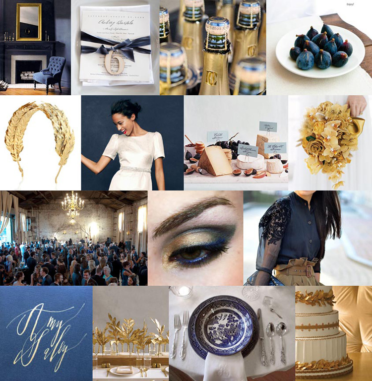 Свадебная палитра: нейви-блю и золотой. Нейви-блю – это особенный синий цвет, очень благородный, очень насыщенный и глубокий. В сочетании с золотым цветом получается романтичная свадебная палитра. Если вы внимательно присмотритесь к этой палитре, у вас обязательно возникнут некоторые ассоциации со стилем ар-нуво. Такие материалы, как бархат, золотые листья, шелковый жаккард добавляют еще больше шика в этой богатой палитре.