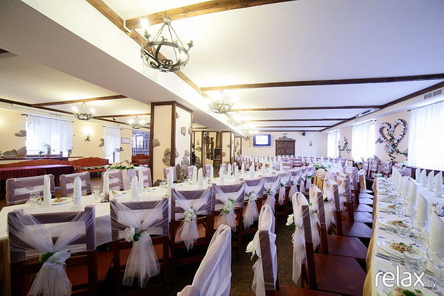 Мы с БМчиком решили все-таки съедить еще какое-нибудь кафе посмотреть. Поехали в "Лаванду" сначала. Расположение кафе нам не очень понравилось, т.к. совсем рядом трасса и оно как-то не совсем уютно получается, а вот зал очень даже симпатичный, НО  он уже занят на нашу дату. После этого поехали на базу ФПБ в Ратомке смотреть их ресторан. От МКАДа совсем не далеко, около 5 км. Понравилось, что у них своя отдельная территория. Зал очень просторный, достаточно светлый. По фоткам я как-то не могла понять, как у них там столы ставятся, но нам сказали, что на наше количество людей (а их 58 на данный момент) столы поставят буквой П с "разъезжающимися" ножками.  Во второй половине зала устроим танцпол. По сравнению с "У Гаспадыни" тут гости точно не будут друг другу на ноги наступать. Места хватит всем. Зал может вместить и 80-90 человек. А еще там есть балкончик, т.к. ресторан находится на втором этаже. Там летом стоят диванчики и можно небольшой фуршетик устроить для тех, кто вышел подышать свежим воздухом. Выходит, правда, дороже слегка. Примерная цена около 230-250 тыс/чел. + обслуживание 3$/чел. + работают они до 23.00, а за каждый час нужно еще 50$ доплачивать. Из своего можно овощную и мясную нарезку и спиртное. Короче, мы посмотрели, подумали и решили оставлять залог!! Так что банкет переносится в ресторан Базы ФПБ!!!