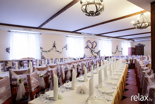 Мы с БМчиком решили все-таки съедить еще какое-нибудь кафе посмотреть. Поехали в "Лаванду" сначала. Расположение кафе нам не очень понравилось, т.к. совсем рядом трасса и оно как-то не совсем уютно получается, а вот зал очень даже симпатичный, НО  он уже занят на нашу дату. После этого поехали на базу ФПБ в Ратомке смотреть их ресторан. От МКАДа совсем не далеко, около 5 км. Понравилось, что у них своя отдельная территория. Зал очень просторный, достаточно светлый. По фоткам я как-то не могла понять, как у них там столы ставятся, но нам сказали, что на наше количество людей (а их 58 на данный момент) столы поставят буквой П с "разъезжающимися" ножками.  Во второй половине зала устроим танцпол. По сравнению с "У Гаспадыни" тут гости точно не будут друг другу на ноги наступать. Места хватит всем. Зал может вместить и 80-90 человек. А еще там есть балкончик, т.к. ресторан находится на втором этаже. Там летом стоят диванчики и можно небольшой фуршетик устроить для тех, кто вышел подышать свежим воздухом. Выходит, правда, дороже слегка. Примерная цена около 230-250 тыс/чел. + обслуживание 3$/чел. + работают они до 23.00, а за каждый час нужно еще 50$ доплачивать. Из своего можно овощную и мясную нарезку и спиртное. Короче, мы посмотрели, подумали и решили оставлять залог!! Так что банкет переносится в ресторан Базы ФПБ!!!