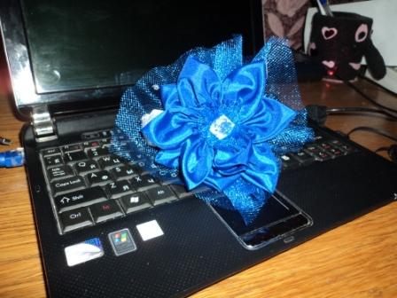 Ещё вчера вечером сделала цветочек)) Думаю, девочкам каждой на девичник по такому на руку сделать... Он, конечно, ещё кривоват, но я учусь)) А кот не оценил( У него какой-то скептический взгляд  Ток цветочек в синем цвете пока)) Эт пробный))) А ткань дома ток такого цвета осталась)) Критика приветствуется!