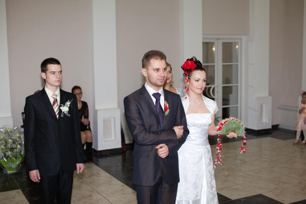 В ЗАГС было очень весело идти - со всех углов выползали наши гости, в окнах торчал народ ) К скольки мы туда дошли - не имею ни малейшего представления ) Единственное, что помню, это чьи-то слова о том, что до росписи 10 минут, а мы ещё дома :mrgreen: Значицца дошли мы до ЗАГСа, а вокруг - никого, ни одной пары в свадебных платюшках. Я таааааак обрадовалась сему факту, что вам не передать. Когда мы зашли в оное помещение, то там я увидела ещё одних желающих расписаться. Кто-то из их гостей спросил:" Вы на 12-00?". "Неа, - отвечаю я и нагло улыбаясь иду вперёд ))) Встречает нас тётенька, уточняет время росписи и говорит сдавать верхнюю одежду в гардероб. Значицца сдали, я оборачиваюсь - а вторую пару уже ветром сдуло ))) Нас с любимым отправили в комнаты жениха и невесты. Наш оператор Митя спросил у меня, что я чувствую. Какие, к чёрту вопросы???? У меня нервы уже на пределе!!!! Что-то ему буркнула и продолжила увлекательное занятие по нарезанию кругов по комнате. Наконец-то нас позвали к залу регистрации. Тётенька говорила там что-то, куда стать, куда нет, кому слова благодарности говорить, куда спиной не поворачиваться. А у меня не то, что в одно ухо влетело - в другое вылетело, у меня даже до первого ничерта не долетало.... И тут нам включают мендельсона и мы заходим в зал. Регистратор начинает говорить свою речь (я даже почти прослезилась в какой-то момент, но в какой?). Пошли мы потом свои афтографы ставить, потом свидетели. Потом снова мы пошли кольца одевать друг другу. Мне легко колечко оделось,а вот любимому..... Пыталась насунуть - никак не лезет ))) В конечном итоге он отвернулся от гостей спиной и втихаря сам себе его одел :mrgreen: За время регистрации мы успели рассмотреть где сидели какие гости и обсудить, что наши мамы сели отдельно вдвоем и что-то там обсуждали и покорчить рожицы нашему фотографу ) Но все это время я ощущала тепло рук своего любимого человека, стоящего рядом. Ещё в самом начале церемонии он положил свою ладонь мне на руку и нежно поглаживал её.... Эти простые движения успокаивали и наполняли меня осознанием того, что я теперь навсегда принадлежу ему, а он мне. Что с этого момента больше нет нас по отдельности,а появилось новое понятие МЫ. Что с этого момента мы все горести и радости будем делить вместе, и это возносило меня на вершину неба....