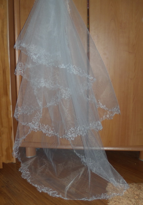 А я похвастаюсь еще своей фатой. Заказ сделали вовремя. Все как договаривались. Нижний самый длинный слой крепится на двух крючечках. В загсе и на венчании буду в длинной фате, а потом на фотосессии отстегну один слой. Фата обалденная. Мне очень нравится. Просто в восторге. Очень легкая и приятная. Девочки молодцы. надо будет написать им красивый отзыв где-нибудь. Заслуживают наивысших баллов. Вложение: