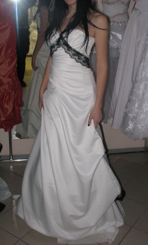 Вот и вернулись мы, наконец-то, с примерки! Платье ещё совсем в "сыром" виде. Корсет, драпировка - всё на булавочках. Боялась двигаться, чтобы оно с меня не свалилось, т.к. из-за отсутствия шнуровки оно совсем было не затянуто. Кружево мы только приложили и закололи булавочками. Минут 20 думали, как же это кружево расположить на платье, в итоге придумали вот так. Пока не знаю, что делать с кружевом сзади: либо сделать небольшой бант и оставить свисать концы кружева примерно до середины юбки, либо довести кружево только до шнуровки (бант не делать). Шнуровка тоже будет чёрная. Сегодня на меня надели подъюбник на 2-х кольцах, но на самом деле будет подъюбник "сетка-американка". Поэтому проступающих из-под платья колец, как на фото, не будет.  Фата будет такая же, только с малюсенькими чёрными жемчужинками. Туфли будут вот эти, что на фото.  В дополнение - коротенькие чёрные сетчатые перчатки. Следующая примерка через неделю, на след. выходных (ещё позвонят и скажут конкретней когда). Естественно, всё будет более ровнее, аккуратнее, не будет выглядеть таким мешковатым и гораздо лучше сидеть на фигуре.