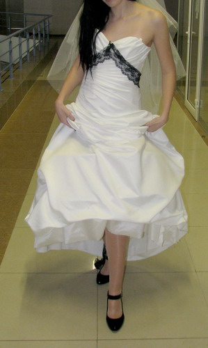 Вот и вернулись мы, наконец-то, с примерки! Платье ещё совсем в "сыром" виде. Корсет, драпировка - всё на булавочках. Боялась двигаться, чтобы оно с меня не свалилось, т.к. из-за отсутствия шнуровки оно совсем было не затянуто. Кружево мы только приложили и закололи булавочками. Минут 20 думали, как же это кружево расположить на платье, в итоге придумали вот так. Пока не знаю, что делать с кружевом сзади: либо сделать небольшой бант и оставить свисать концы кружева примерно до середины юбки, либо довести кружево только до шнуровки (бант не делать). Шнуровка тоже будет чёрная. Сегодня на меня надели подъюбник на 2-х кольцах, но на самом деле будет подъюбник "сетка-американка". Поэтому проступающих из-под платья колец, как на фото, не будет.  Фата будет такая же, только с малюсенькими чёрными жемчужинками. Туфли будут вот эти, что на фото.  В дополнение - коротенькие чёрные сетчатые перчатки. Следующая примерка через неделю, на след. выходных (ещё позвонят и скажут конкретней когда). Естественно, всё будет более ровнее, аккуратнее, не будет выглядеть таким мешковатым и гораздо лучше сидеть на фигуре.