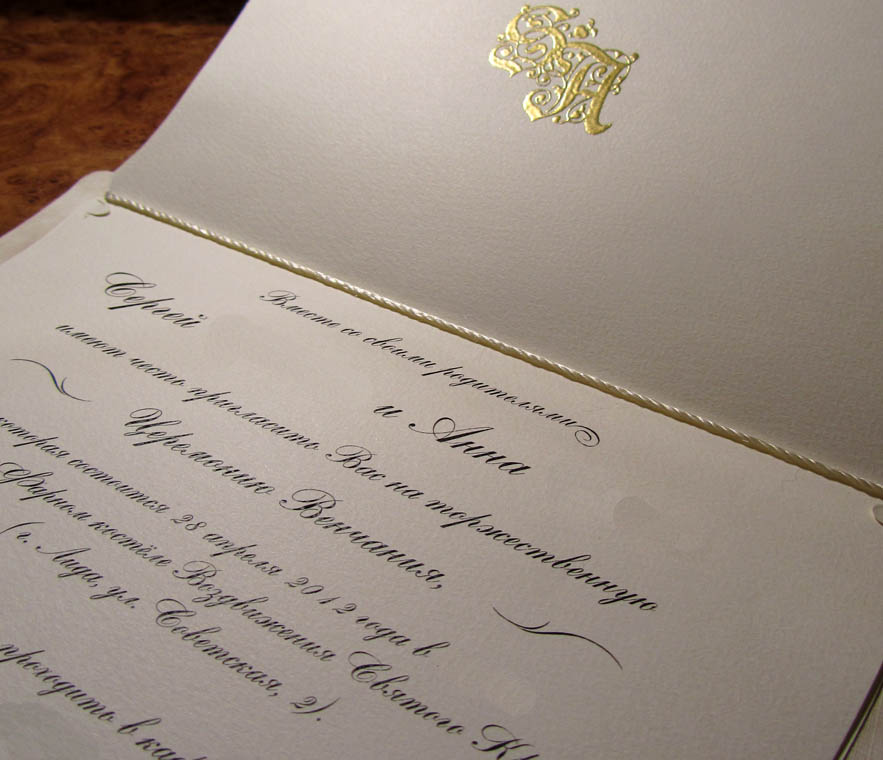 Jasmie, приветик! Когда в январе наткнулась на твою темку, была рада проследить путь твоих подготовок, т.к. мой БМ хоть и минчанин, но страстно любит Британию, всё английское (антикварное прежде всего), да и сам временами бывает в Лондоне по нескольку месяцев. Поэтому тот колорит ему хотелось в некоторых элементах внести и в нашу апрельскую свадьбу. И пока я тут читала темки, он в Лондоне уже во всю выбирал смокинг со всеми прибамбасами, решал, как и где делать пригласительные итп. И когда я ему рассказала по скайпу о твоих идеях для приглашений, он ответил, что как раз недавно смастерил нашу монограмму (он это любит. сургуч и штамп с личным инициалом у него уже лет 10 есть. тоже из UK). Заграницей пригласительные делают в тысячи раз интереснее и лучше, чем у нас (сама знаешь), поэтому была идея напечатать там, но проблема возникла с кирилличным текстом. Короче, купили лишь без текста, а тут допечатывали. Монограмму хотели заказать в специальной машинке, чтобы ставить тисненые оттиски на любую бумагу, но цена зашкаливала - 200 фунтов. Поэтому остановились на американском способе с печатью, золотым порошком и нагревом. В итоге - объёмная монограмма золотого цвета. Вот так, просто решила поделиться - всё-таки что-то общее...