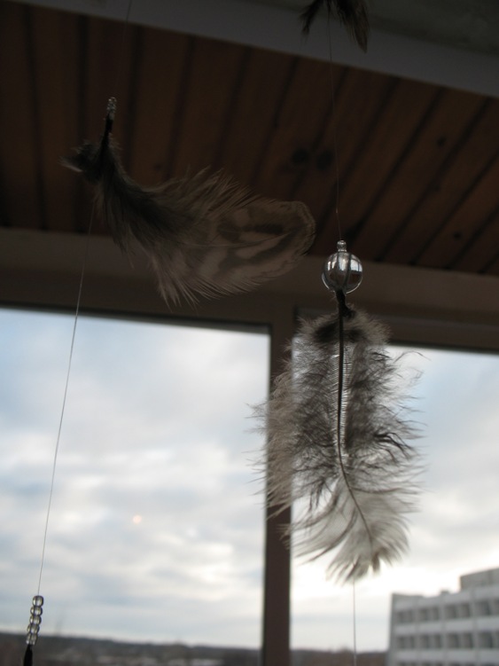 Вот и первые 6 нитей пёрышек) Я выпала в осадок, когда купила леску и размотала её - она была волнисто-кудрявая, я её долго пыталась выпрямить, и ничего не вышло, думала, её уже никак не выпрямишь  Но интернет делает своё дело, достаточно горячей кастрюли - и всё отлично  Потом ещё феном её "приглажу", как советуют Фотограф из меня неудачный, это точно Мне пёрышки нравятся, лески почти не видно, а бусинки смотрятся, как капельки росы. Будет висеть, наверное, в комнате, где меня собирать будут (по частям  ), хотя теперь мне больше хочется взять её с собой для фото А ещё я поняла, что хочу такие пёрышки себе в букет, в бутоньерку, а ещё на мой ободок, который вместо фаты