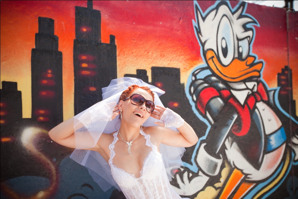 Из дома мы сразу поехали на фотосет 1: стена, граффити, парк Горького. Ехали мы в разных машинах, но рядом со мной были мои самые близкие - лучшая подруженька (она же свидетельница) и младший братик (который на младшего уже не смахивает). По дороге были оч смешные моменты. Мне крестная должна была передать матирующие салфетки, но так сложились обстоятельства, что мы не пересеклись, а когда ее муж приехал к нам домой, мы уже выезжали! и тут начался настоящий Нид фор спид :mrgreen: В общем, Александр догнал нас на каком-то перекрестке и в прямом смысле слова зашвырнул эти салфетки в салон машины :mrgreen: :mrgreen: Интересно было наблюдать за реакцией прохожих на 1ю нашу машинку)) один дядя так выворачивался, что чуть не упал :mrgreen: