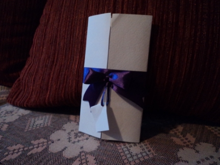 Из новостей:1. Бонбоны выходят на финишную прямую  Совсем скоро (думаю, к концу недели) вам их покажу 2. Нужен небольшой критико-совет. Пробую сейчас делать конверту для приглашалок. Вот жалкие потуги  На качество и бумагу (она будет немного другая) пока не смотрите, это проба, чтоб узнать, получится ли что-то вообще))) Вопрос вот в чём:а) что написать на маленькой квадратной бумажке: дату или наш логотип б) нормально ли, что бантик не развязывается. Надо тянуть горизонтальную ленту вврех, т.е. снимать её, дверцы конверта открываются и там приглос (надеюсь, понятно объяснила  ) ЖДУ!