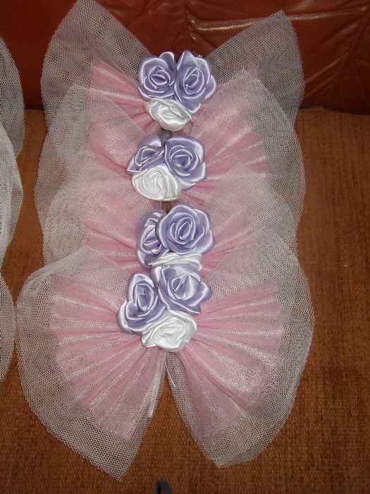 Юлия-я, эх, надо же поднапрягаться, как никак меньше месяца осталось...навдохновлялась твоим букетом и решила свой переделать))) Вчера весь день розочки крутила  Melnikova писал(а): молодец))) А какие ручки на машинах? да вот я пока не знаю. Если будут у нас бээмвэ, то скорее всего такие, которые вверх поднимаются - вот на них я и не знаю, как цеплять. Просто сначала наделала украшений, а потом подумала(
