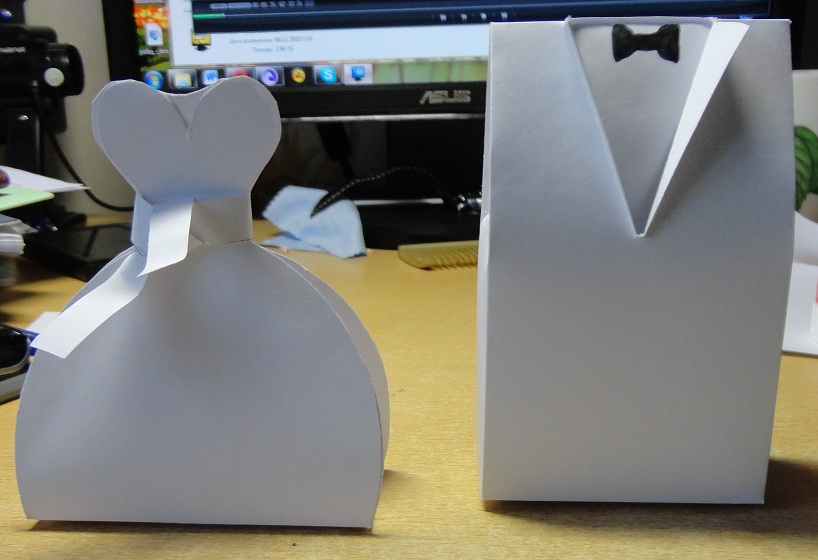 Подготовка пока приостановилась из-за того, что ещё очень много времени для броней, взносов и авансов, да и денег пока особо нет. плюс с этому цены 500 раз могут поменяться, так что пока о чём-то глобальном не думаем. Пока решила обзавестись мелочами. Регила по-немногу делать бонбонки. вот что получилось. они пока не оч аккуратные, но это была первая проба. скорее проверка-смогут ли моя руки сделать что-то красивое. вот правда,пока не решила жениха делать в белом или черном цвете, т.к. БМ хочет светлый костюм) Да, и вместе бумажки на невесте будет ленточка в цвет гамме свадьбы