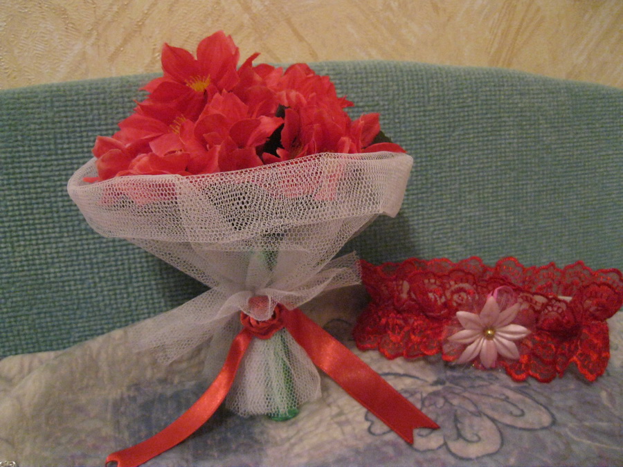 Вобщем ничего особенного, подвязка красная. т.к. покупалась до того как определилась с цветом свадьбы (цветочек я поменяла, думаю еще розовинькую ленточку пришить, чтобы не выбивалась из цветовой гаммы). Если честно я ни когда не была на свадьбах сделанных в определенной цветовой гамме, первый раз увидела что и у нас такие делают на форуме, поэтому и накладка в цветах получилась. Но так как я не хочу определенный цвет розовога, а несколько разных (как в букете который мне нравится), то для меня не так страшно, что все не в один цвет.