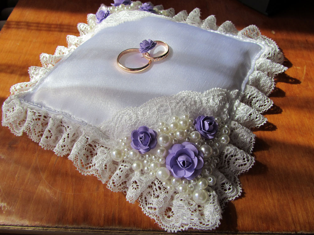 Fiana, Mamzel_Victoria, Martinika-Marine, Yupi! Спасибо, девчонки! Свадьба прошла великолепно! Только сегодня вернулись с мужем в Минск. К сожалению, до свадьбы не было времени выложить на форуме всё, что хотела (аспирантура + работа ). Поэтому буду продолжать сейчас. Итак, наша подушечка для колец. [center]