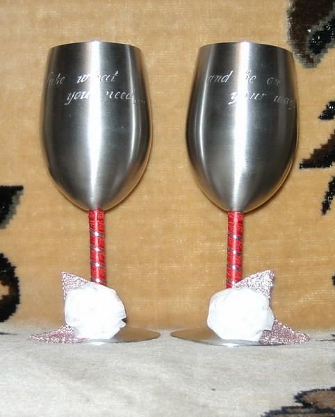 Бокалы! Сильно не бить Светопередача у фотика дикая. На первом фото более-менее цвета похожи на настоящие. Волнуюсь за крепление розочек. Там просто двухсторонний скотч, как бы не отвалились. На клей брать не хочу, боюсь испортить бокалы, а мы планируем ими пользоваться потом еще долго-долго  Вложение: