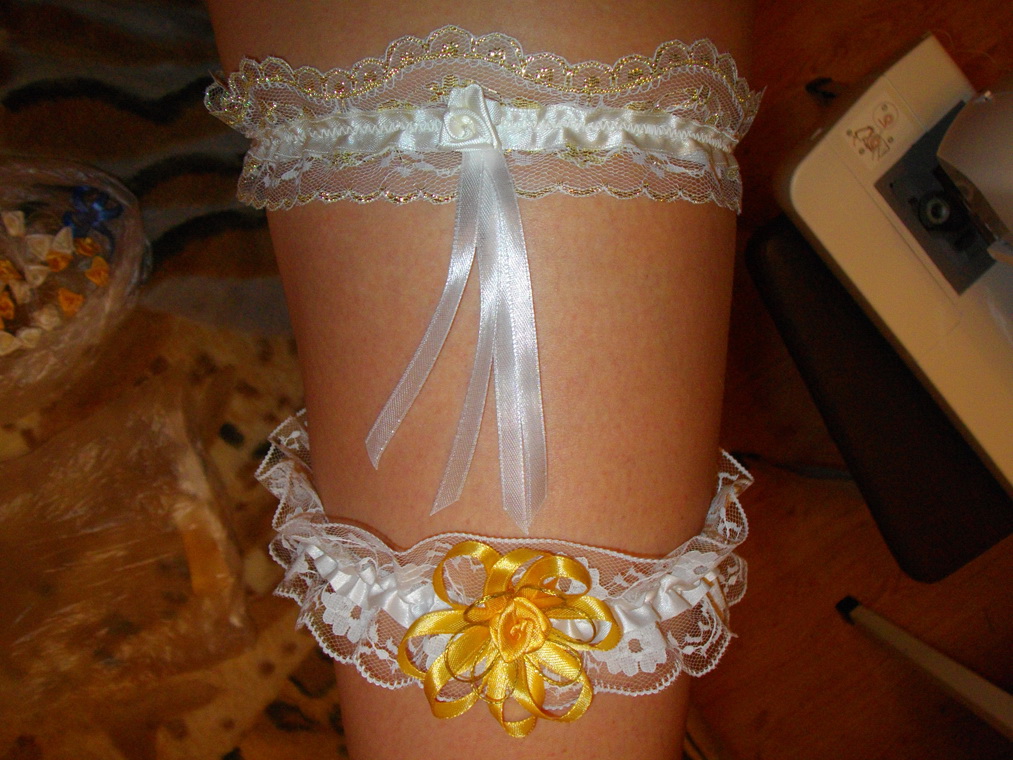 Купила одну подвязку, основу оставила, цветочек свой сделала. А потом села и сшила еще одну подвязку, оказывается она очень легко шьется, можно было не покупать. Та что с золотым цветком, основа куплена, цветок мой. Та, что с белым цветком - полностью моя. Вложение: