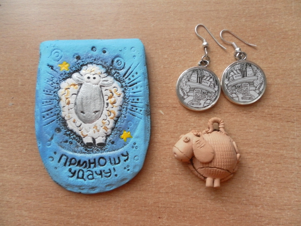 Девочки, наконец-то я раздобыла фотик =) Показываю как и обещала фотки подарков от БМ-чика. Тут большой магнит, маленький керамический барашек, которого на шею можно вешать и сережки. Я умилялась, когда он мне все это дарил. Вложение: