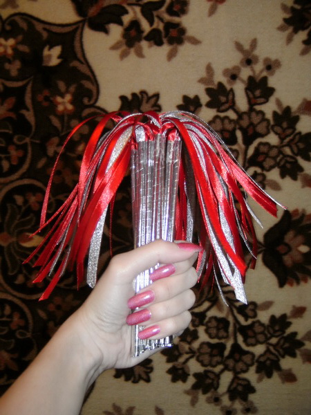 2) Нарезала ленточек в цвета свадьбы. У меня их 5 штук: 3 красные и 2 серебряные. Вложение: