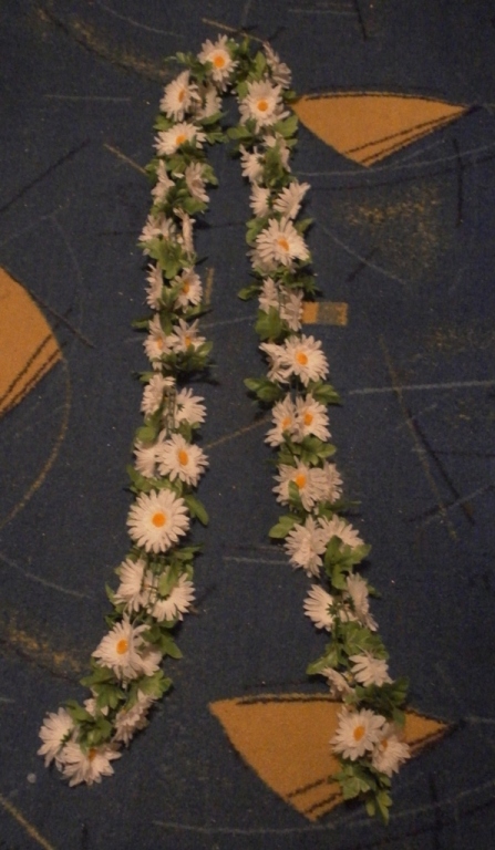 Сегодняшний день принес несколько новостей. Вообще мы отправились с сестрой на поиски туфель. Обошли Зеркало, Силуэт, Подземный город. Мне приглянулись только одни на Силуэте. Белые классические, сзади как бы разрезик и бантик завязан, есть только одно НО! я хотела каблучок побольше  Завтра штурмуем Жданы, если нет, то придется брать эти. Негаданно-нежданно я купила ленты на машины с ромашками :D и еще цветочки, чтобы сделать цветы на ручки  И была удивлена выбором искусственных ромашек на Комаровке. Даже почти подобрала букетик на дублер, он красивый, но тяжеловатый и его придется разделять, ибо таким можно и убить  В общем еще думаю. Девочки, кто-то писал, что на Комаровке продается дешевый фатин... Где???И еще, хватит ли только ленты на капот? Не будет ли она одиноко смотреться? Что-то типо этого хочу на ручки