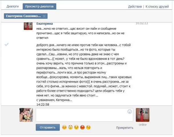 Первые пять претензий я написала фотографу, ниже прилагаю нашу переписку, чтобы не быть голословной. С остальными уже ничего не поделаешь, к сожалению. 3. По поводу напарника:На нашу свадьбу Alex Зеленко попросил взять напарника, со словами «вам это ничего не будет стоить, человек потренируется, а вам будет в 1,5 раза больше фоток». В итоге, мы об этом очень сильно пожалели. Напарника он взял, но вот фото от напарника мы так и не увидели. Мы пытались добиться этих фоток с конца ноября 2012, когда забирали наши, до января 2013. Фото Алекс Зеленко так и не отдал (подробности смотрите в переписке в конце отзыва). 4. По самому свадебному дню и содержанию фото:В сам свадебный день мне казалось, что все идеально… Просто мне хотелось так думать. Кое-что в поведении нашего фотографа Alex Зеленко, нам не понравилось 1) Нет ни одной фото как мы выходим из подъезда, рассаживаемся по машинам 2) Пока мы ходили по парку, он все время шел далеко впереди со своим напарником... 3) Когда мы в парке вернулись к гостям и сестра мужа попросила нас сфоткать, фотограф сказал, что будет фоткать нас в столовой и мы очень опаздываем, хотя мы были не против сфоткаться с гостями на природе. Так что фоток с девчонками у меня, как и фоток мужа с парнями у нас нету . Вообще к концу свадебного дня у меня просто сложилось впечатление, что он хотел просто как можно быстрее от нас свалить. 4) Нет фоток как мы приехали в столовую. Зеленко ехал на другой машине и приехал раньше нас. Но сразу убежал наверх (при том, что за день до свадьбы, я сказала, что хочу сфоткаться на К.Маркса (у нас там была столовая)). Моему дяде почему-то ни дождь, ни холод не помешали дождаться нас и сфоткать как мы приехали. 5) У меня нет ни одной фото меня со сборов невесты. Алекс Зеленко сказал, что меня фоткал напарник, фотки напарника «типо» вышли плохого качества и все… Фото аксессуаров тоже нет, хотя все лежало вместе и подвязки и кольца и свечи… Специально все было выложено на полочку около зеркала. А я обращала внимание именно на сборы! Что я хочу чтобы обязательно сфоткали как меня красят, мои аксессуары !!! Но фотограф просто проигнорировал мои просьбы.5. Из послесвадебного общения:Фотограф наотрез отказывается признавать свои ошибки, а еще и пускается в оскорбления (см. ниже в переписке). Я выкладываю сюда фото нашей переписки, просто чтобы вы могли объективно оценить ситуацию (на первом читать снизу вверх ). Вложение: