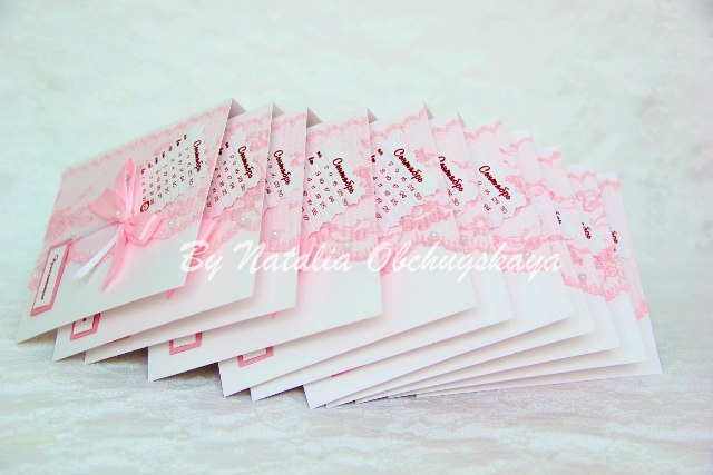 и мне больше всего понравился первый! особенно идея с календариком!) Подскажите, может кто делал такого плана приглосительные, а чем клеить гипюр на картон?