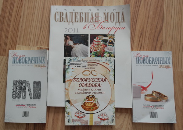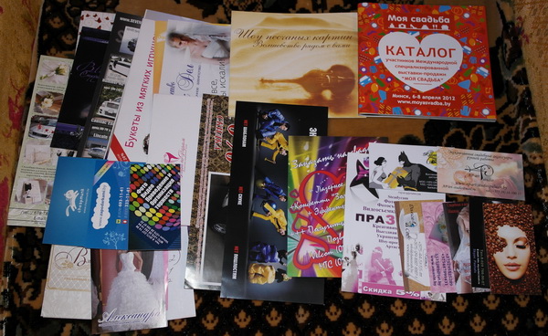 Отдам свадебные журналы прошлых лет (2011, 2012), книгу про традиции белорусской свадьбы (подробнее не знаю что там, покупала мама, я не читала), кучу различных буклетов, визиток, купонов на скидки (лень разбирать на что и сколько их), которые собирала долгие месяцы до своей свадьбы по выставкам, салонам, знакомым и т. д. Жалко выкидывать. Может кому-нибудь пригодится.