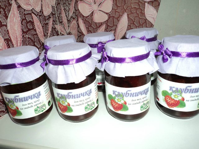 alisaR, супер, согласна карточки рассадки и бонбоны в баночках это круто, мы тоже будем такие делать,только вот задумались,что варение в сентябре скорее всего все уже сами себе накатают и будет это ненужно, решили мёдик туда класть,затратно конечно,но зато мило и как раз осенью, когда всегда дожди и холодать начинает от простуды)))И надпись можно классную прилепить на баночку)))вот так у нас))) ползунки просто милашечки, я вчера ксттии когда ходили по магазинам у своего БМ всё выпытывала,куда деньги будем ложить на девочку на мальчика,но он 2 раза тему менял не специально надеюсь  и в итоге я и забыла)))