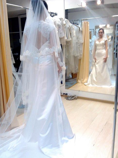 Платье я искала буквально несколько дней... Уивдела в на сайте и все... другие даже мерять не хотела.... Правда теперь, сомневаюсь по поводу длины фаты. Может стоит до колена брать? и в один ярус, чтобы максимально была видна спина? На примерке фата длинне платья, я без каблучков и загара, еще не похудела ( сейчас животика нет). ЗА фото сорри, подружка фоткала на телефон :(