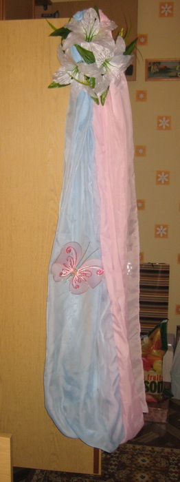 Narvla у меня есть похоие украшение, цвета розово-голубые, завершается это все композицией из лилий и на самом полотне пристегнута бабочка...фоток жалко нет, приду домой сфоткаю и сброшу)