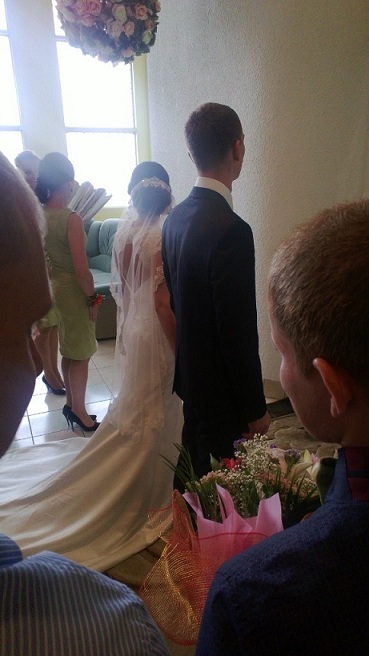 Я подкрасила губки… и вот мы стоит перед входом в зал бракосочетания!!!! У меня сердце просто бешено колотилось !!!! заиграла музыка….. и мы вошли.. я представила какой вид сзади открывается гостям…..невероятная спина… длинный шлейф….ммммм