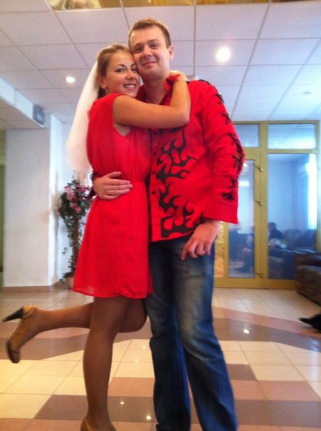 Возвращаясь к моему рассказу про утро! Мы проснулись, позавтракали и начали думать в чем же нам пойти в загс! Я остановилась на красном платье Mango + у меня была фата с девичника, Леха решил одеть тоже красную рубашку с какими-то черными языками пламени и джинсами!!!!