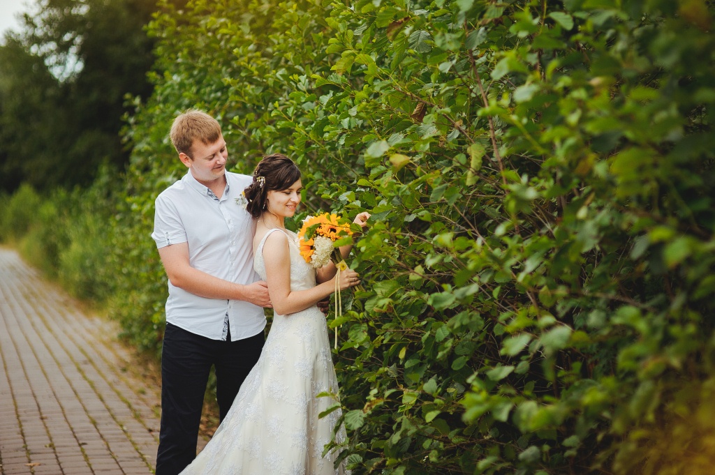 Было уже около четырех часов дня, когда мы подъехали к Дроздам. Снова пошел дождик. На этот раз мелкий и противный. На улице было достаточно прохладно и серо, трава и деревья стояли полностью мокрые. О том, чтобы выставлять декор на вторую фотозону речи быть не могло... Я расстроилась и перенервничала, да и наше время подходило к концу. В шесть нас ждали в кафе. Это значило, что на то, чтобы пофотографироваться у нас оставалось от силы минут 40... Реквизит остался лежать в машине, а мы, взяв букет и зонтики, пошли гулять под дождем... В первую очередь мы направились в то место, где состоялся наш первый поцелуй: в самом начале парка, на обрыве над рекой, между стоящими рядом сосной и дубом, что сплелись кронами, будто обнимаясь... Вложение:
