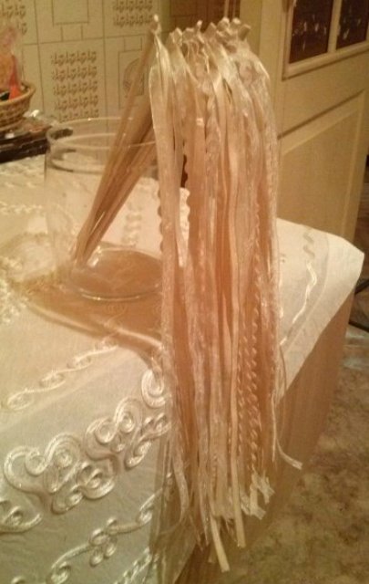 Ура-ура-ура,первая партия готова  Сделала 13 палок, осталось еще 27. Решила делать 40 штук) Итак, как это было))) 1. Купила ленты. Все бежевого цвета. Одну-волнистую, одну-атласную, одну-полупрозрачную. 2. Купила 2 упаковки палочек для суши. всего получилось 40 палочек 3. Отрезала ленточки длиной в 40 см. Брала 1 волнистую ленточку и по 2 атласной и полупрозрачной. В итоге получилось 5 ленточек на 1 палку-махалку. 4. Кончики всех ленточек обожгла зажигалкой, чтобы в дальнейшем кончики не расходились и не пушились. Скрепила 5 ленточек ниткой, ну то есть просто сшила. 5. Намазала нижнюю ленточку суперклеем, обкрутила скрепленные ленточки вокруг палки и закрепила парой стежков. Вот и все)))