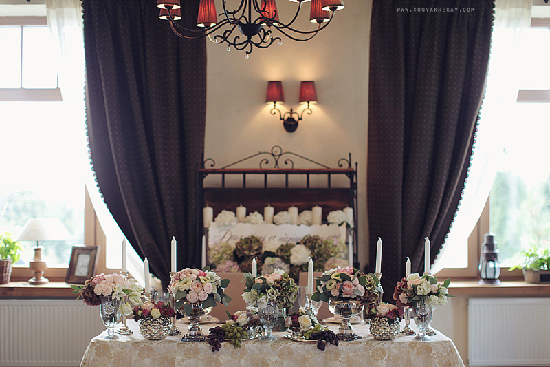 Если очень хочется сохранить бежевые стулья, то я бы брала что-то в сочетании с золотыми оттенками, вот посмотри как здесь например, скатерти с легким узором, вазы и подсвечники с блеском, а сами цветы в бело-розовой гамме. К тому же тут в оформлении и виноградик и цвета подобраны отлично для августовской свадьбы.