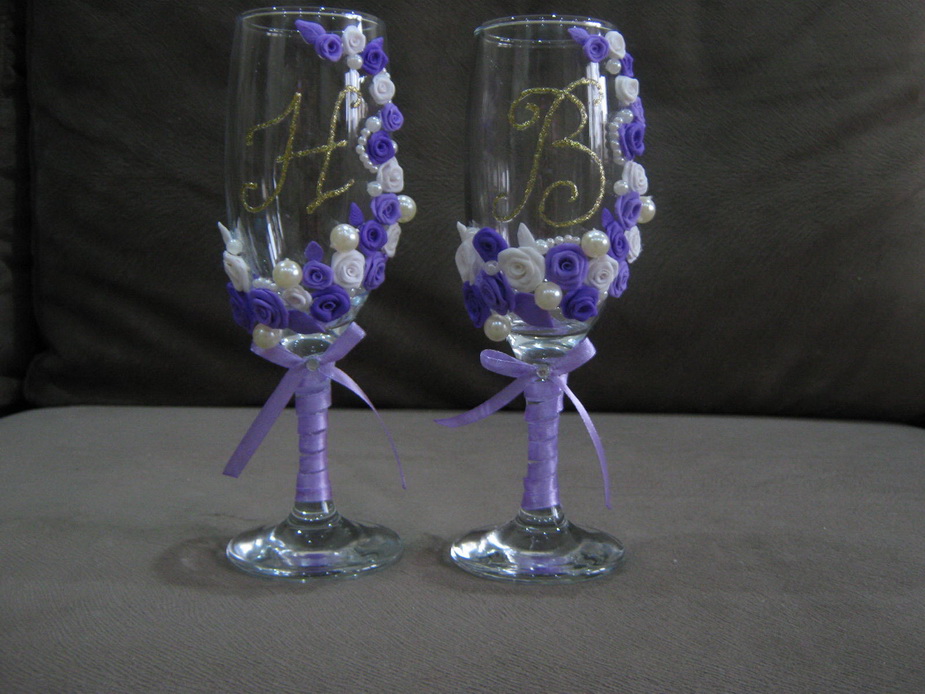 nastena13, попробуй убрать один ряд цветочков у основания. Их там слишком много. Если будет идти тонкая полоска из цветочков снизу вверх - получится нежнее. И (может быть ) не так плотно обкручивай ленточкой ножку. Может быть попробовать сделать ее полосатенькой ( с промежутками). А так плотная обмотка зрительно укорачивает ножку. А в целом - основная идея премиленькая. Просто чуток поэксперементируй с одним из бокальчиков. А потом сравнивай его со вторым!